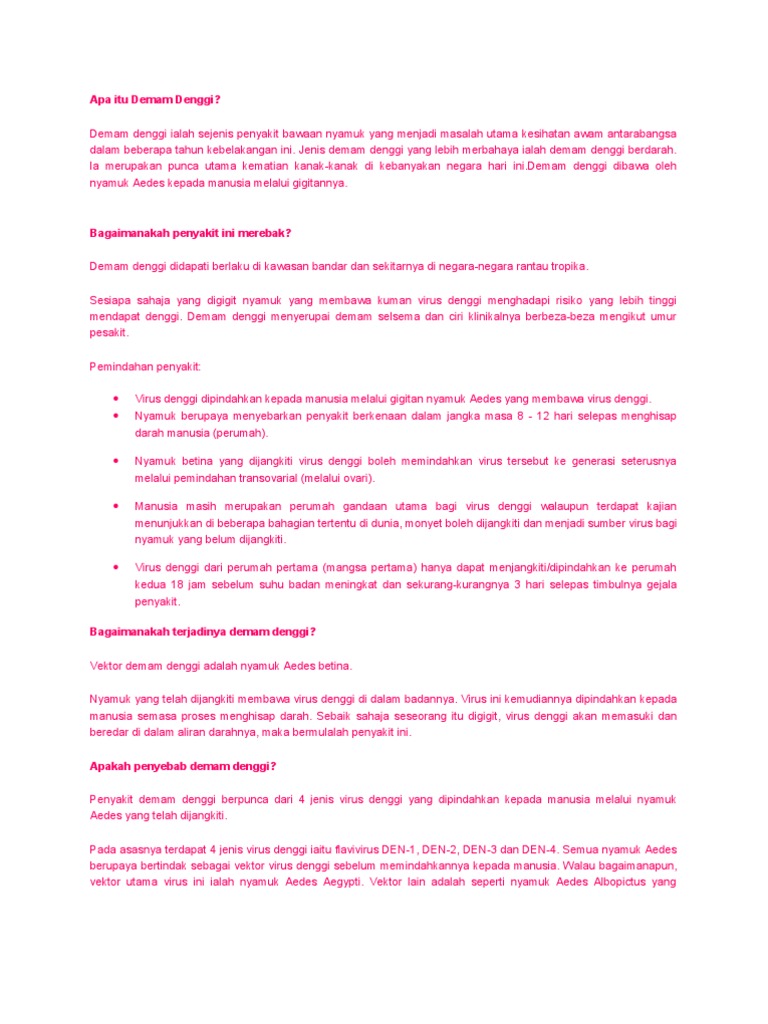 Masih tiada rawatan khas untuk demam denggi. Sesiapa sahaja yang digigit nyamuk yang membawa kuman virus denggi vektor demam denggi adalah nyamuk aedes betina. Apabila wanita hamil mengalami demam denggi, kesan buruk tidak hanya dirasai sendiri. Sejurus tiba di hospital, doktor meminta saya membuat pemeriksaan darah kerana bimbang saya terkena denggi. Demam denggi (dengue fever) adalah penyakit yang disebarkan oleh nyamuk aedes aegypti.