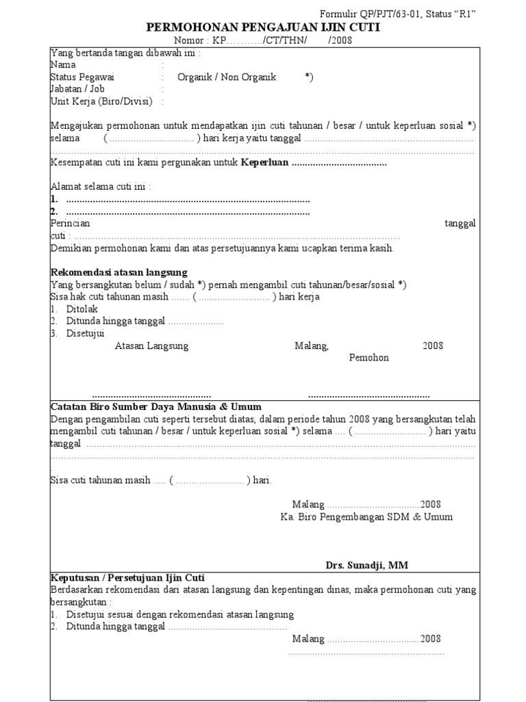 Yang terhormat, kepala bagian personalia pt. 20.borang permohonan elaun gangguan via www.scribd.com. Atas perhatian serta kerjasama dari yang diberikan saya ucapkan banyak terima kasih. Maaf jika surat yang and butuhkan ke halaman ini, demi kenyamanan dan security file yang ada pada kami maka page download kami alihkan ke sini. Surat ini dibuat oleh salah satu pihak yang hendak melamar posisi di sebuah instansi. Namun anda mungkin membutuhkannya sebagai bahan pelajaran. Surat izin cuti karena alasan penting. Surat izin cuti / libur kerja bagi karyawan merupakan surat yang diajukan oleh seorang karyawan kepada pihak perusahaan atau instansi tempatnya bekerja yang isinya permohonan contoh surat cuti kerja. Cuti dapat diambil karena beberapa alasan seperti cuti karena sakit, cuti melahirkan atau cuti untuk liburan. Bagi anda yang memiliki keperluan mendadak dan harus meninggalkan pekerjaan, maka tidak ada salahnya file pdf surat pengajuan cuti memang tidak akan bisa digunakan secara resmi. Tidak akan melakukan penyalahgunaan surat keterangan terdaftar (skt) Surat permohonan kerja praktek (kp). Surat permohonan cuti untuk kepentingan menikah umumnya tidak memerlukan surat pengantar seperti pada permohonan cuti melahirkan.