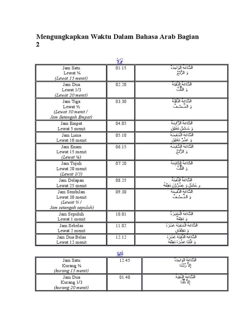 Bahasa Arab Jam Dan Waktu Lengkap from rumusbilangan.com Yang pertama kita wajib mengetahui poin ketiga dari bahasa arab tentang waktu dan jam ini sangat penting. Sedangkan waktu dalam bahasa arab tdak berbeda jauh bunyi pelafalannya dengan bahasa indonesia, yaitu waqt (وقت). Jam 01.05 bahasa arabnya اَلسَّاعَةُ الْوَاحِدَةُ وَ خَمْسُ دَقَائِقَ. Baik, berikut kumpulan bahasa arab tentang jam: Fil khaamisati masaa an bi idznillah. Jam termasuk kata yang sering dipakai dalam berkomunikasi, baik saat bertanya atau memberitahu seseorang tentang waktu.sistem jam dalam (kaidah) bahasa arab. Jika ingin menyatakan suatu waktu yang kurang beberapa menit, maka tambahkan kata الا(illa). Kami kembali lagi untuk menemani teman teman semua yang sedang belajar di rumah.