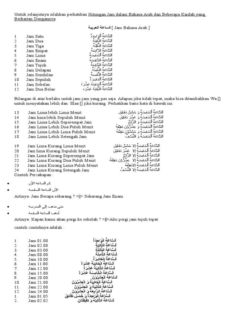 Salah satu topik yang cukup menjadi perhatian. Kosakata bahasa arab jam 1 sampai jam 12. Tulisan tentang 21 contoh mukadimah dalam bahasa arab dan indonesia beserta latinnya (lengkap) yang dijelaskan secara terperinci oleh dutadakwah. Jam dalam bahasa arab disebut السَّاعَة. Dalam mempelajari sebuah bahasa tentunya kita harus memiliki pembendaharaan bahasa yang banyak agar kita bisa berbicara menggunakan kosakata tersebut dalam sebuah percakapan, termasuk belajar bahasa arab.