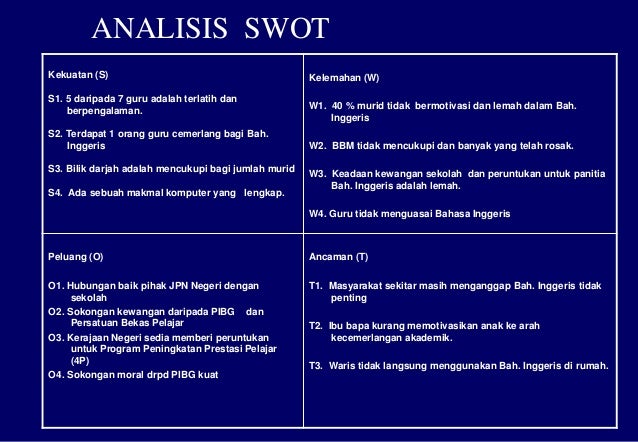 kelemahan (weakness) sesetengah guru yang mengajar bahasa. Secara ringkasnya swot itu merupakan singkatan dari strength, weakness, oppportunity, dan threats. Ada puluhan methodologies untuk menganalisa bisnis. Cara termudah membuat gambar grafis analisis swot tanpa perlu memikirkan desainnya. Memang analisis swot biasanya banyak dipakai oleh perusahaan terutama ketika ingin menetapkan strategi bisnis.