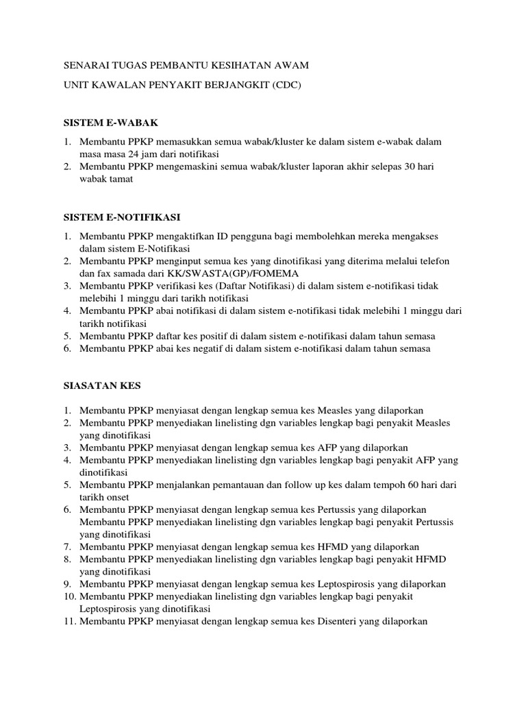 Download as docx, pdf, txt or read online from scribd. Seorang pembantu kesihatan awam hari ini dihadapkan ke mahkamah majistret kuala lumpur atas pertuduhan menghalang dan menumbuk anggota bagi pertuduhan pertama dan kedua, mohamad alif syazwan didakwa telah menghalang koperal p thiruselvam daripada menjalankan tugas. 18,052 likes · 158 talking about this. Untuk gred pembantu perawatan kesihatan (pkk) ni adalah gred u11. Apakah deskripsi tugas pembantu perawatan kesihatan u11? Savesave senarai tugas pembantu kesihatan awam for. Sketsa pendek pembantu kesihatan awam : Elaun pembantu khas elaun pembantu khas yang. Pembantu perawatan kesihatan u11 bertanggungjawab : 100%(2)100% found this document useful (2 votes). Suruhanjaya perkhidmatan awam spa menerusi laman sesawang rasminya telah mengeluarkan hebahan jawatan kosong sebagai pembantu perawatan kesihatan gred u11 di kementerian cari jawatan pemabantu perawatan kesihatan dan seret ke kanan, dah sattle ketik simpan. Berita harian online 2 years ago. Bayaran insentif pegawai kesihatan awam bayaran insentif pegawai kesihatan awam yang diperuntukkan dalarn pekeliling perkhidmatan bil.